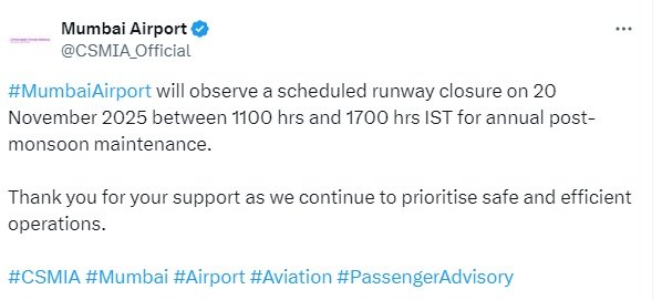 मुंबई। महाराष्ट्र का मुंबई स्थित छत्रपति शिवाजी महाराज इंटरनेशनल एयरपोर्ट CSMIA पर 20 नवंबर को छह घंटे के लिए उड़ान सेवाएं बंद रहेंगी। एयरपोर्ट प्रबंधन ने बताया कि गुरुवार को सुबह 11 बजे से शाम 5 बजे तक दोनों रनवे पूरी तरह बंद रहेंगे। यह फैसला मानसून के बाद होने वाले वार्षिक मेंटेनेंस के लिए लिया गया है, ताकि सुरक्षा और संचालन से जुड़े मानकों को बेहतर बनाया जा सके।